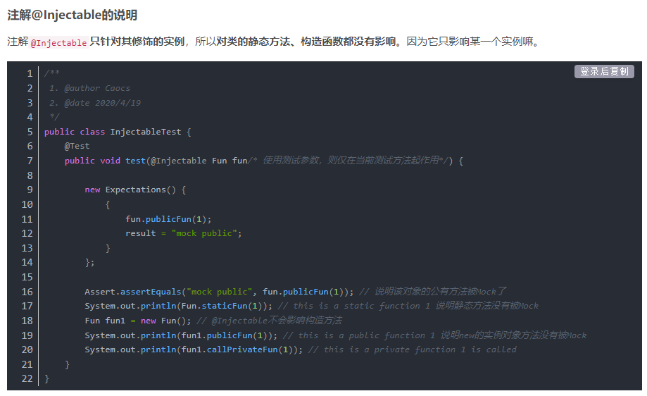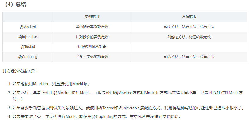 (1)在JMockit中,我们可以用JMockit的注解API来修饰它。这些API有@Mocked, @Tested, @Injectable, @Capturing。不同的注解有不同的含义。