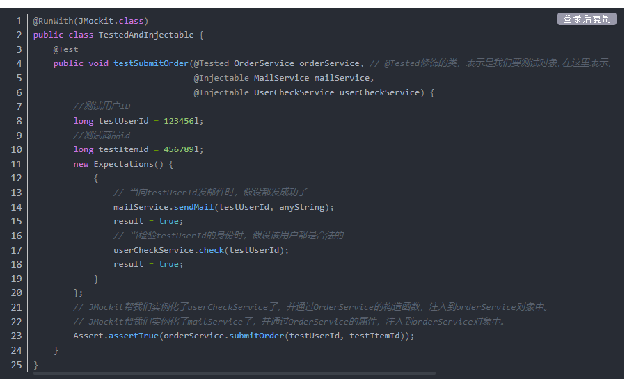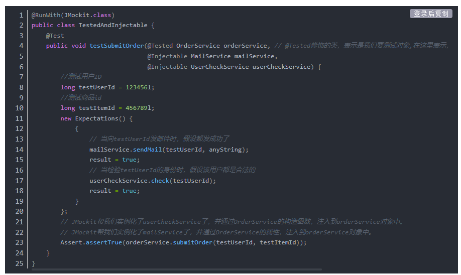 两者搭配使用,JMockit就能帮我们轻松搞定被测试类及其依赖注入细节。