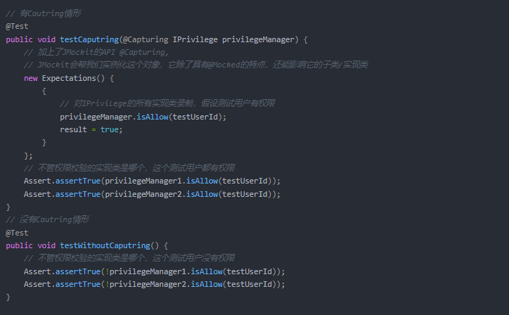 注解@Capturing主要用于子类/实现类的Mock我们只知道父类或接口时,但我们却需要控制它所有子类的行为时,子类可能有多个实现(可能有人工写的,也可能是AOP代理自动生成时),就用@Capturing。