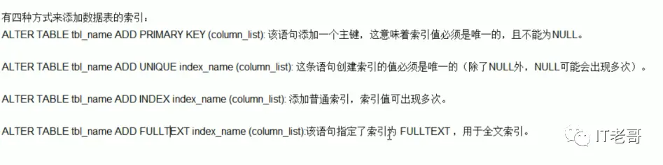 创建二:alter tableName add [unique] index [indexName] on (columnName (length) )