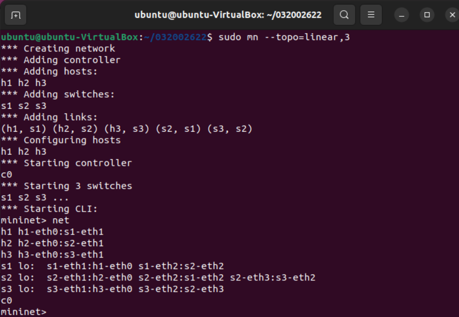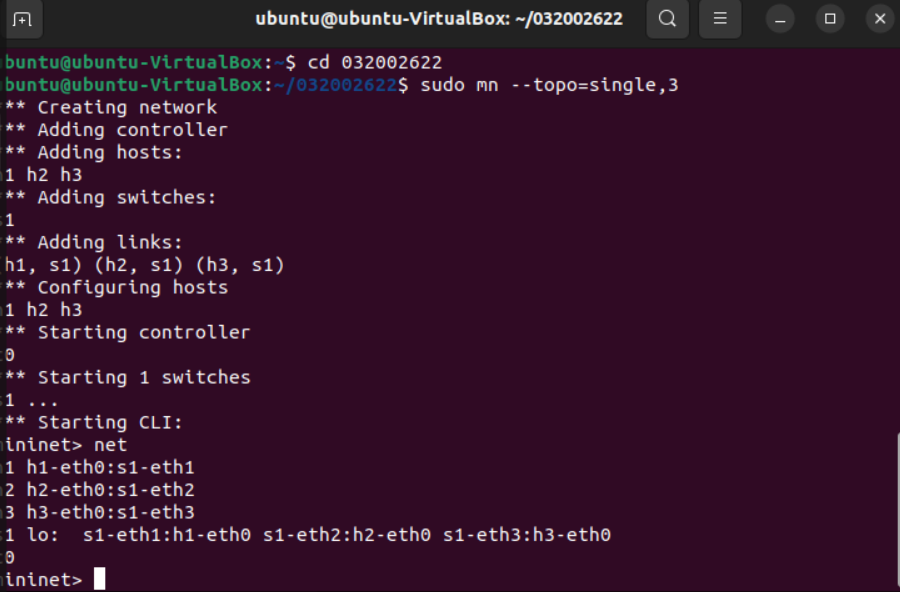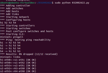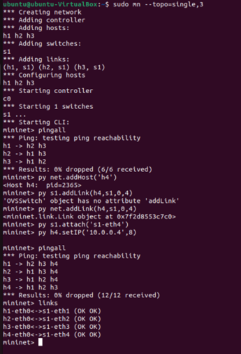 3.在2 b)的基础上,在Mininet交互界面上新增1台主机并且连接到交换机上,再测试新拓扑的连通性