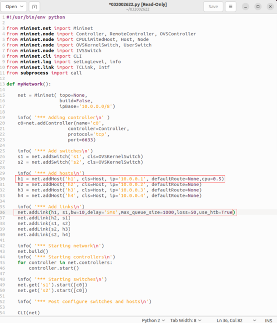 4.编辑(一)中第1步保存的Python脚本,添加如下网络性能限制,生成拓扑: