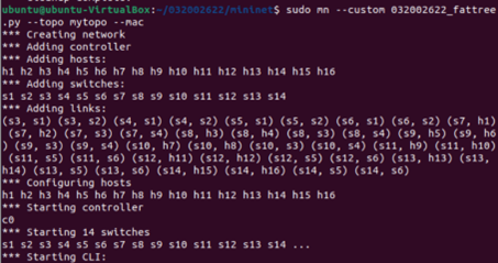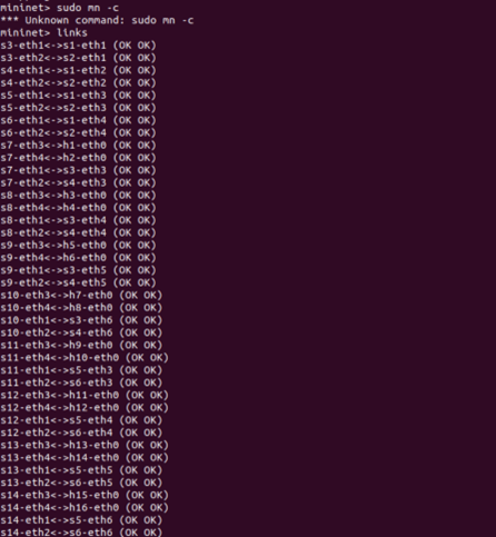② 运行.py文件构建拓扑结构的时候,报错:Exception: Error creating interface pair (s11-eth2,s12-eth2),csdn上查阅资料得知是重复创建导致的,需要删除原先创建的拓扑结构,执行sudo mn -c后再运行.py文件。