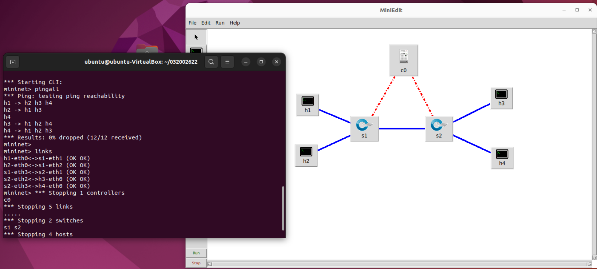 1. 使用Mininet可视化工具,生成下图所示的拓扑,并保存拓扑文件名为学号.py