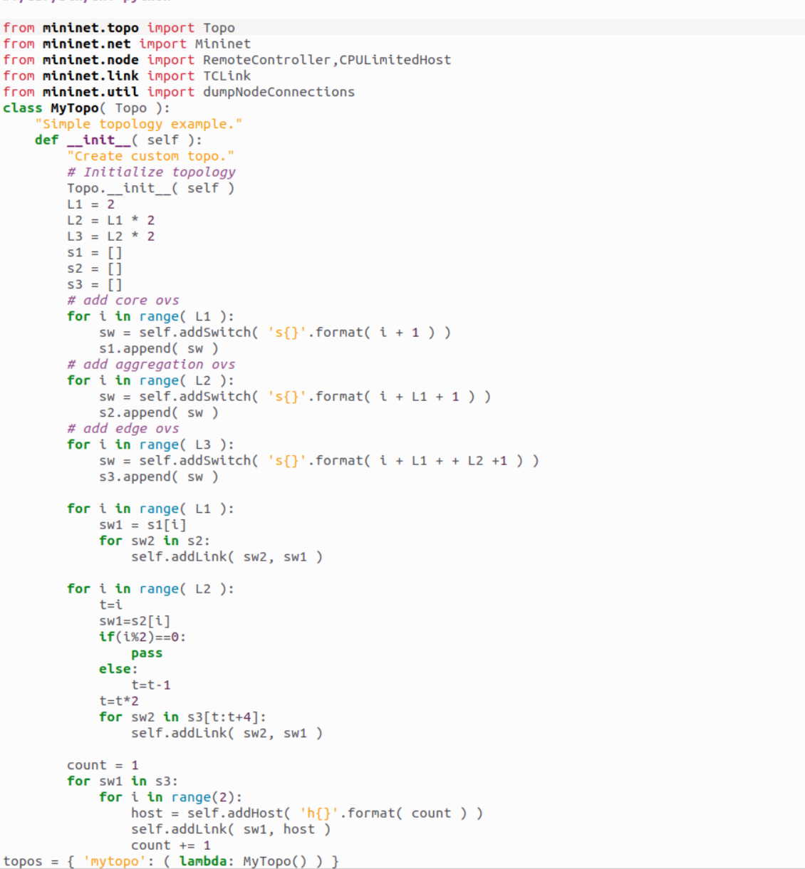这次的实验的基础部分并不难,但是老师提供的文档不能直接用,不仅需要找资料解决运行环境和版本不同导致的错误,还要对文档的内容进行理解应用,并结合网上的资料进一步学习。而进阶部分就对python语法有一定要求了,我转而去学习python语法,结合博客的胖树拓扑,完成了进阶部分的实验。