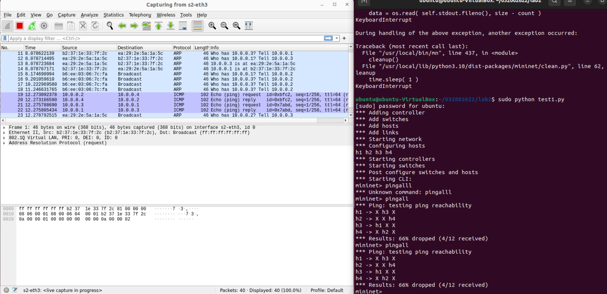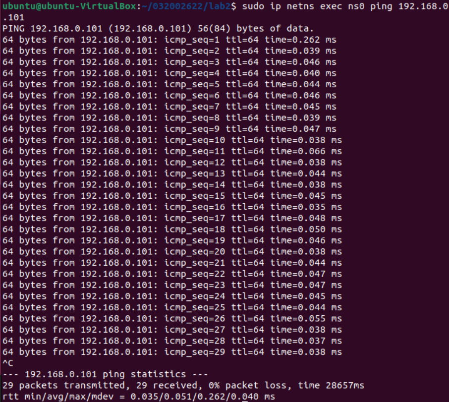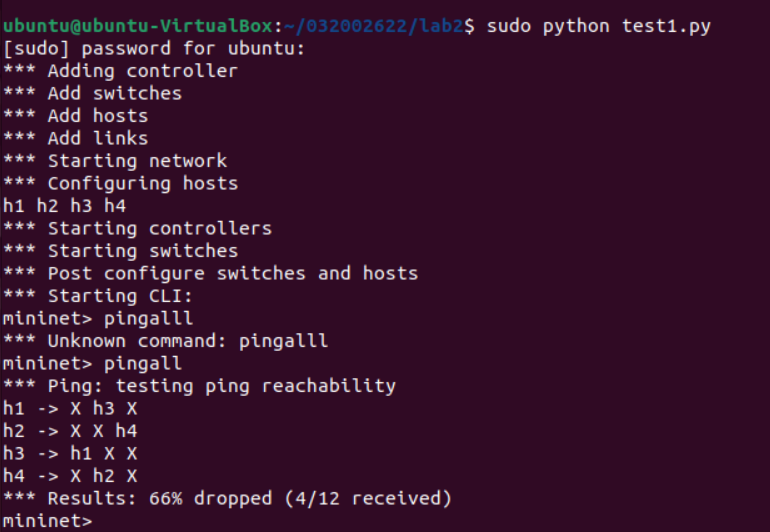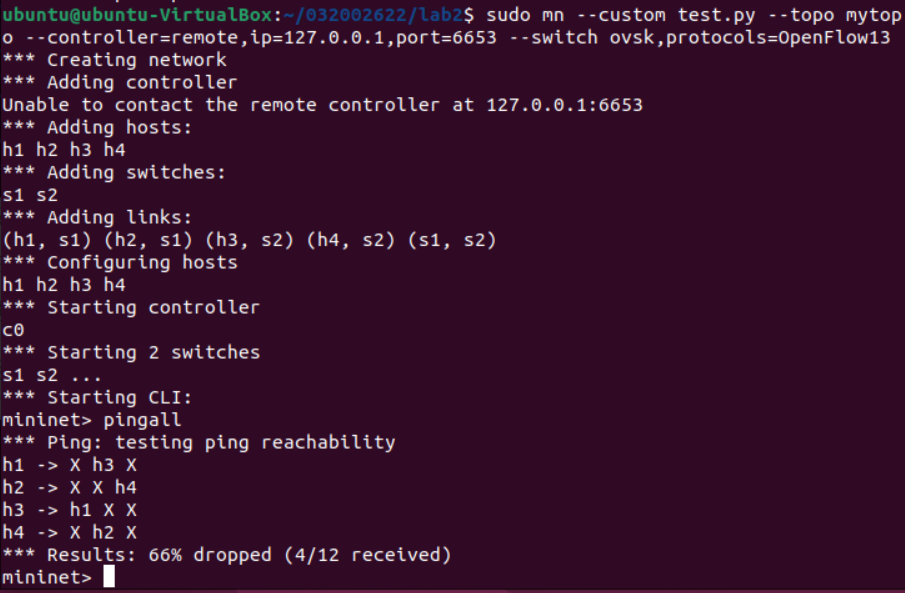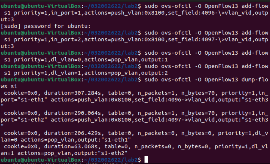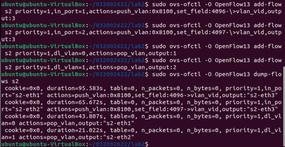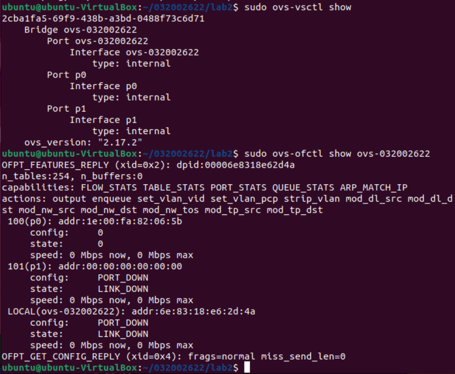 后来,一个坏习惯让我从头开始做:在上一次实验中,我习惯用sudo mn -c来清理建立的拓扑结构,结果这个命令把我创建的交换机ovs-032002622删除了(通过sudo ovs-vsctl show命令才发现创建的交换机和端口都空空如也了)