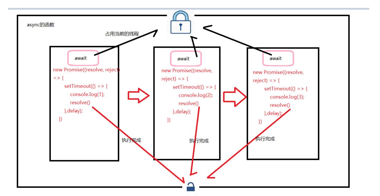 async修饰的函数会返回一个promise对象 , await修饰的promise对象会占用当前的线程 , 直至对应的promise执行完成后才会释放 .