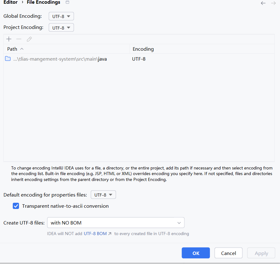 找到“Editor”下的“File Encoding”,按照下图配置: