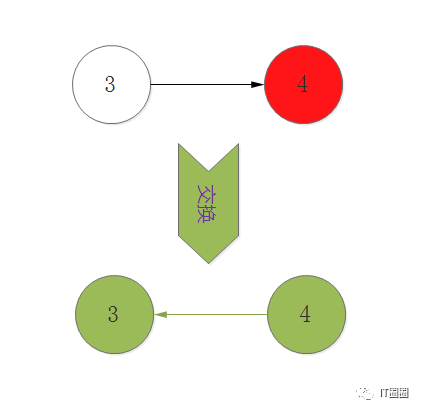 然后2伪装成第一个,重复过程:从3开始"假装"如下:34“已经”被反转完成,然后交换