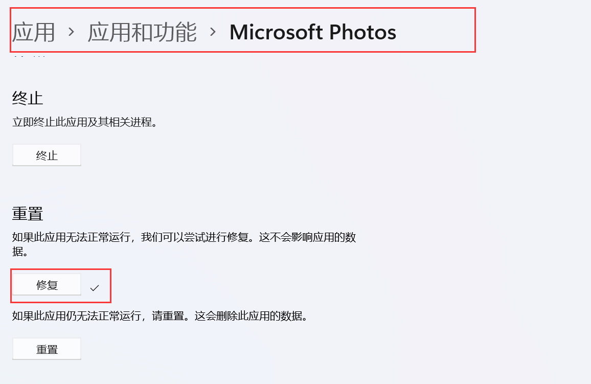 使用打开方式,找到打不开那几种方式,设置里找到应用,分别找到并点击这几个程序的高级选项,下滑找到重置,点击修复,这样你的图片就打开了。