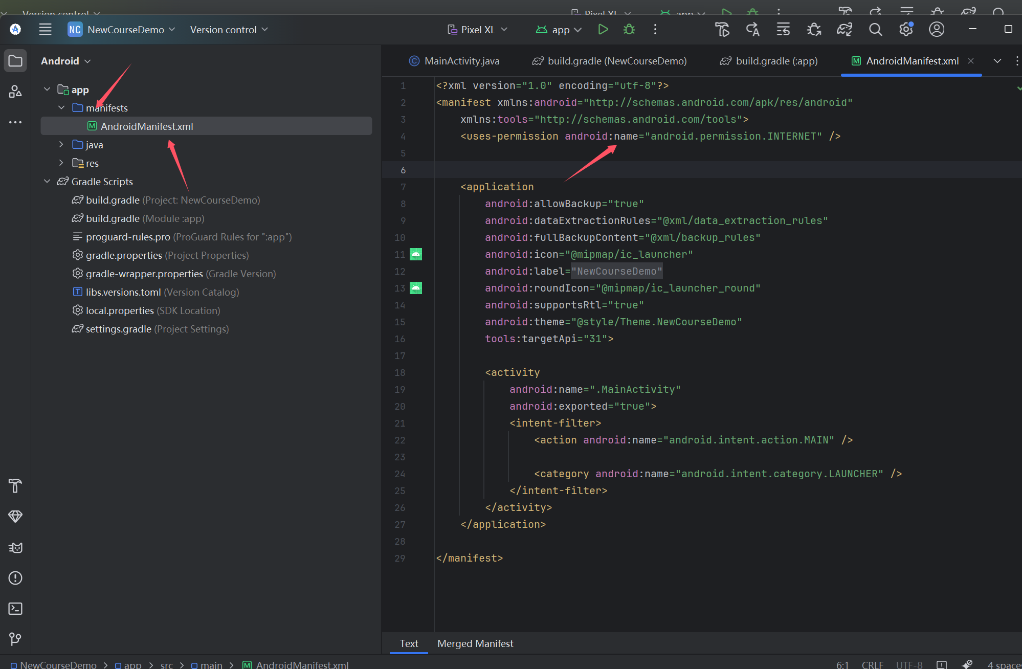 2.在 AndroidManifest.xml 文件中添加 Internet 权限: