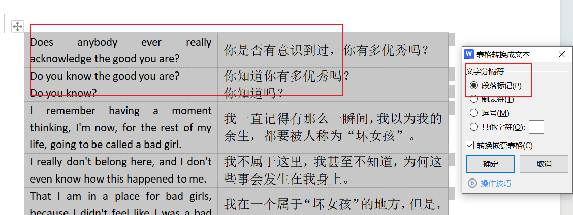 我不想文章弄过来还要一句一句的复制过来复制过去,就在网上搜,也没搜到,还是自己琢磨,瞎捣鼓,一开始是把每句话(中文英文各自文件)分隔开,然后复制到Excel里面去,有些没对齐,改了一会,然后再复制回word,点着点着发现word里面的表格生成文本的有个选项很好用: