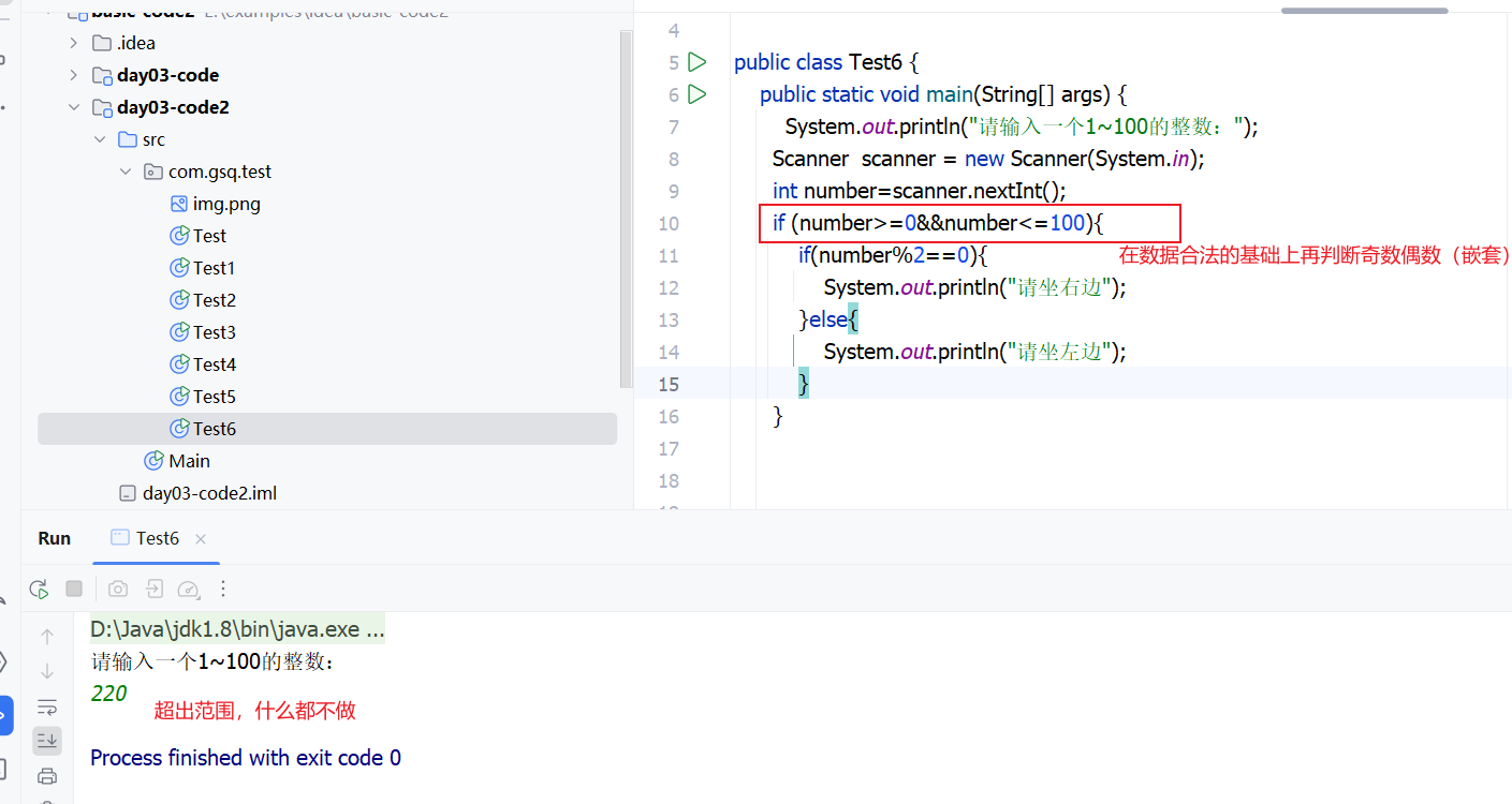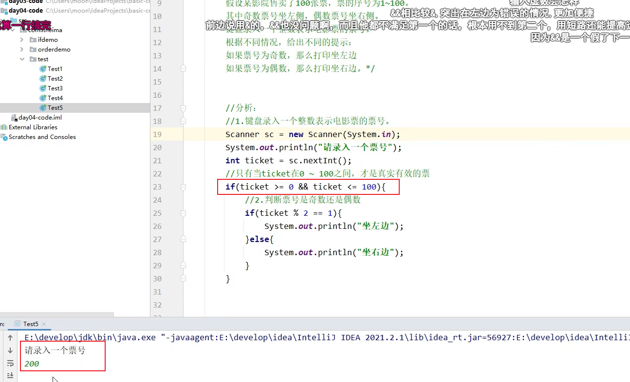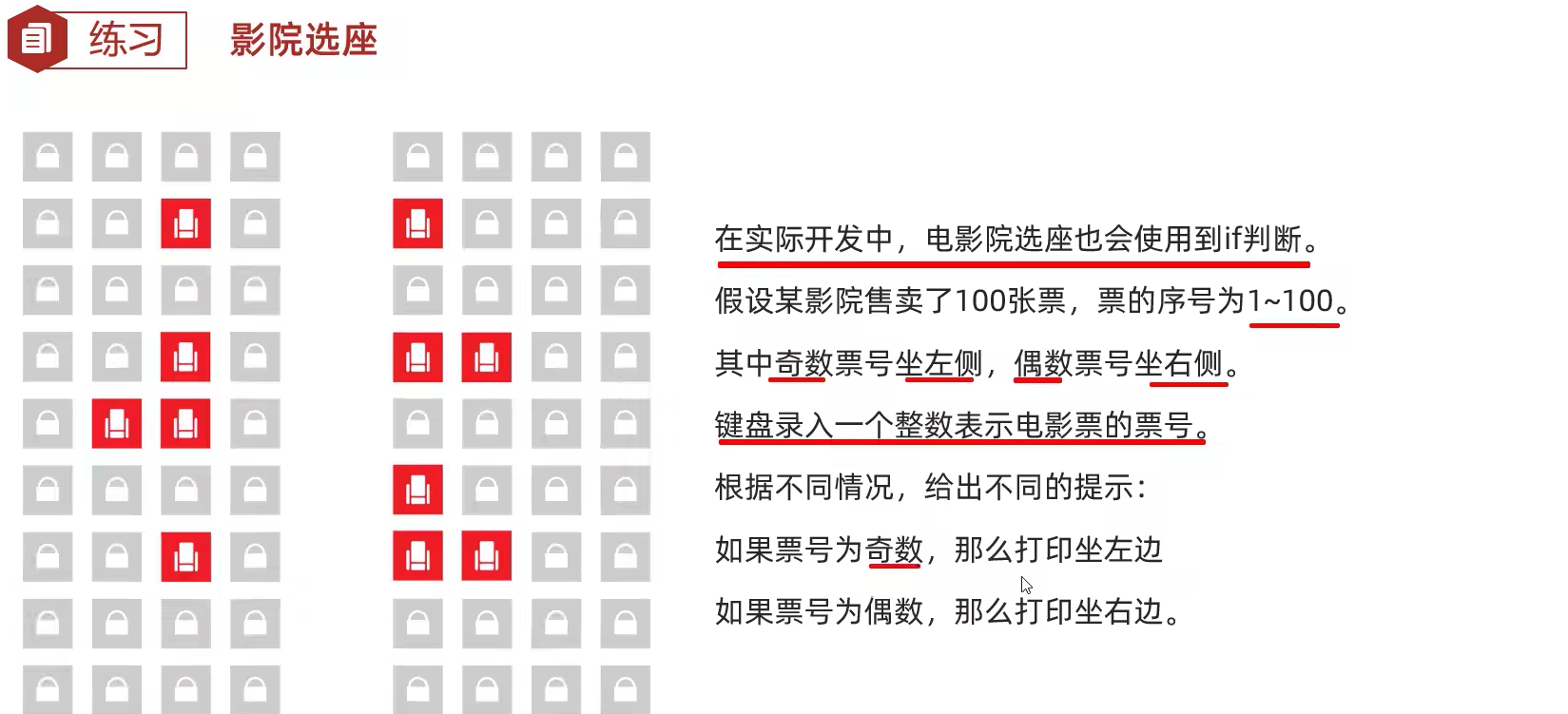 我的代码还差一个步骤(并不是一个提示语句就能蒙混过关滴),即判断用户输入的票号是否符合要求,题目说过只有100张票,所以如果我的代码输入200,程序依旧会执行,所以第一步就需要判断票号是否合法,然后在此基础上再次判断是否为奇数偶数(嵌套)