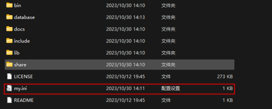 在和bin同级目录创建文件 my.ini(注意必须是这个名字)