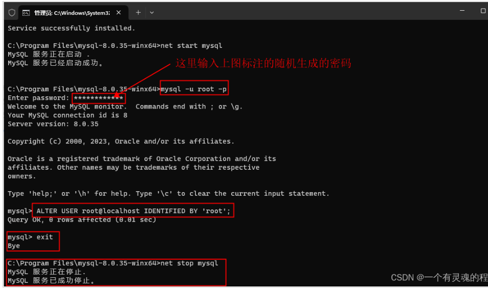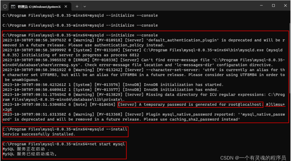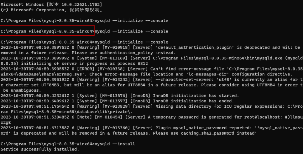 输入命令mysqld --initialize --console初始化数据库。记住最后temporary password is generated for root@localhost:后面生成的随机密码。