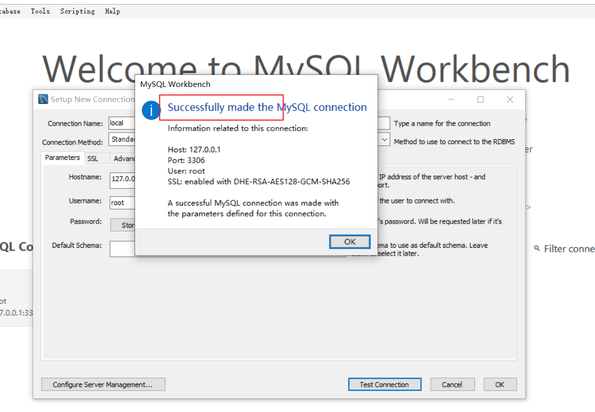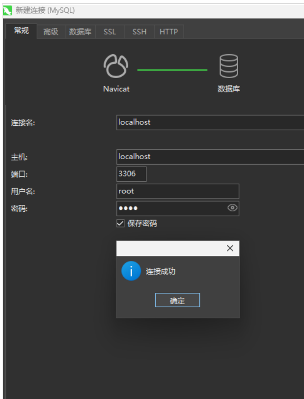 输入连接名、主机、密码,点击测试连接,弹出连接成功。