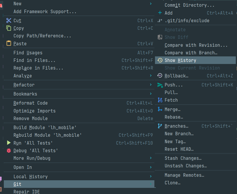 1.右击项目,点击 git -> Show History 查看版本提交记录
