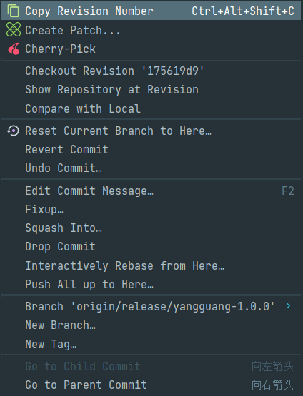 2.分别选择当前版本和需要回退的版本,右击点击 Copy Revision Number 复制版本号保存