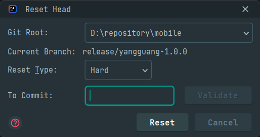 4.Reset Type 选择 Hard,To Commit 填写需要回退的版本号,点击 Reset 进行回退