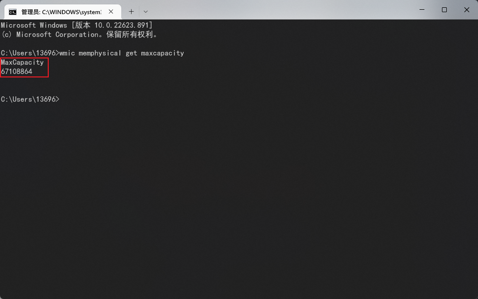 2. 输入命令wmic memphysical get maxcapacity得到数据,单位是KB