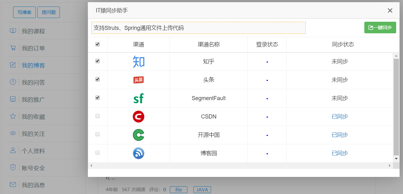 | 使用方法 | 第一步:发布一篇博客文章 第二步:等待站长审核并采用 第三步:进入用户中心->我的博客:点击群发 第四步:点击“一键同步” 注意:操作前必须确保曾登录过这些渠道网站,插件会校验登录状态,已登录的情况下才会同步成功,如果提示未登录,请登录后再同步
