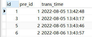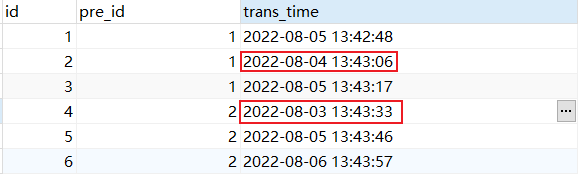 SELECT a.* FROM `test1` a LEFT JOIN ( SELECT pre_id, min( trans_time ) trans_time FROM `test1` GROUP BY pre_id ) b ON a.pre_id = b.pre_id AND a.trans_time = b.trans_time where b.pre_id is null