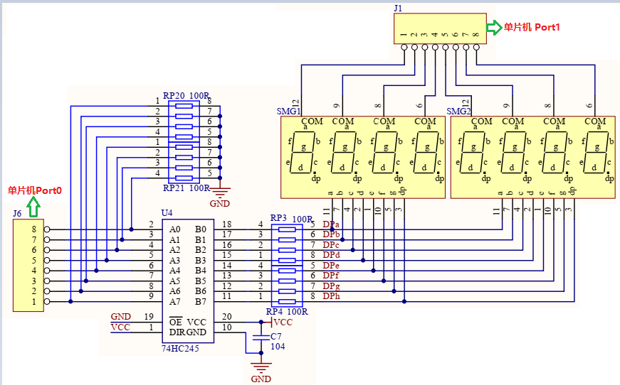 单片机等微控制器的引脚拉电流能力一般在20mA左右,想要直接点亮数码管、显示屏等大功率显示器件则明显不够,这时,我们用一颗74 HC245芯片来增加单片机引脚的驱动能力