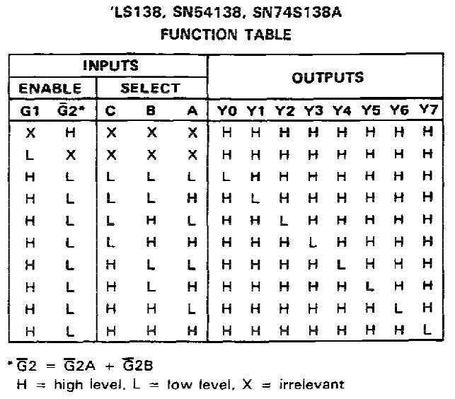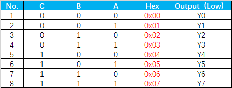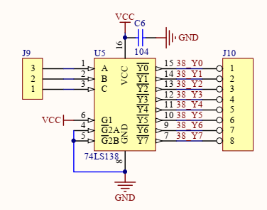 要能控制 Y0~Y7,G1 必须 High level,G2A & G2B 必须Low level。所以电路图中G1 接 Vcc,G2A & G2B 接 GND