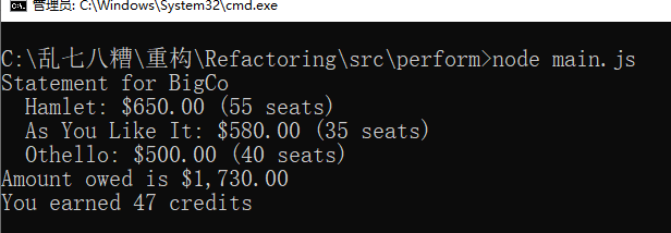 // 为了可视化 import invoice from './invoices.js'; import plays from './plays.js'; function statement (invoice, plays) { let result = `Statement for ${invoice.customer}\n`; for (let perf of invoice.performances) { result += ` ${playFor(perf).name}: ${usd(amountFor(perf))} (${perf.audience} seats)\n`; } result += `Amount owed is ${usd(totalAmount())}\n`; result += `You earned ${totalVolumeCredits()} credits\n`; return result; } function totalAmount() { let result = 0; for (let perf of invoice.performances) { result += amountFor(perf); } return result; } function totalVolumeCredits() { let result = 0; for (let perf of invoice.performances) { result += volumeCreditsFor(perf); } return result; } function usd(aNumber) { return new Intl.NumberFormat("en-US", { style: "currency", currency: "USD", minimumFractionDigits: 2 }).format(aNumber/100) } function volumeCreditsFor(perf) { let result = 0; result += Math.max(perf.audience - 30, 0); if("comedy" === playFor(perf).type) result += Math.floor(perf.audience / 5); return result; } function playFor(aPerformance) { return plays[aPerformance.playId]; } function amountFor(aPerformance) { let result = 0; switch (playFor(aPerformance).type) { case "tragedy": result = 40000; if(aPerformance.audience > 30) { result += 1000 * (aPerformance.audience - 30); } break; case "comedy": result = 30000; if (aPerformance.audience > 20) { result += 10000 + 500 * (aPerformance.audience - 20); } result += 300 * aPerformance.audience; break; default: throw new Error(`unknow type: ${playFor(aPerformance).type}`); } return result; } console.log(statement(invoice, plays));