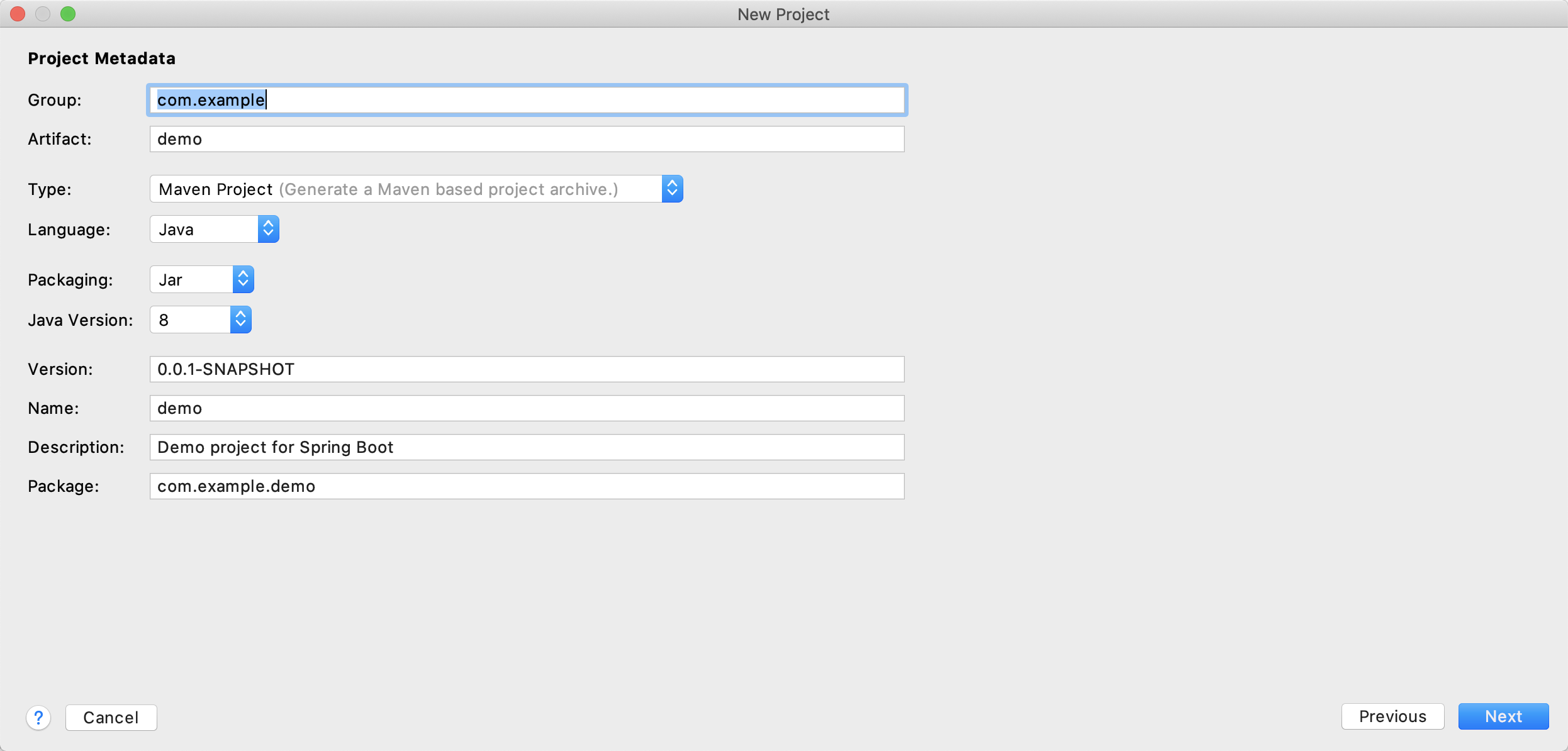 依次打开 IDEA,File > New > Project 选择 SpringInitializr 然后 Next 可以看到填写项目信息界面如下