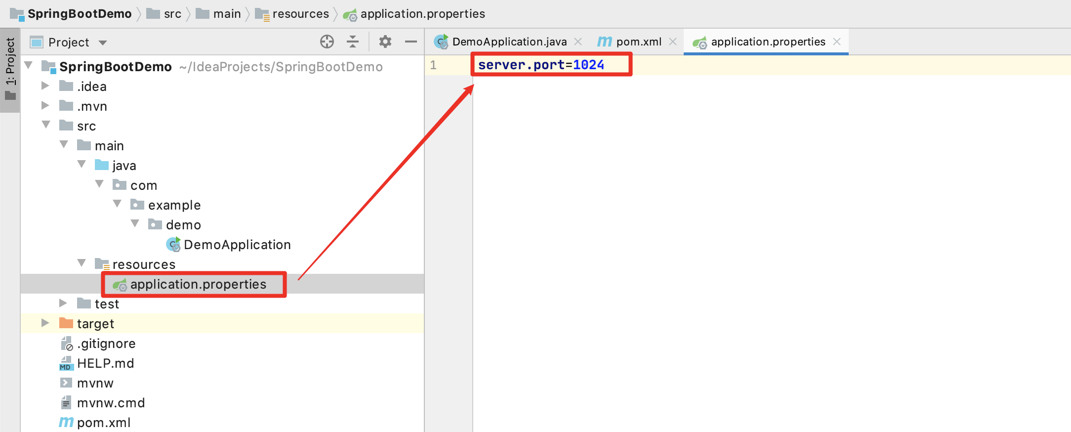 尝试修改端口,在 application.properties 中添加配置 server.port=1024 再次启动,发现 程序监听端口由 8080 变为了 1024