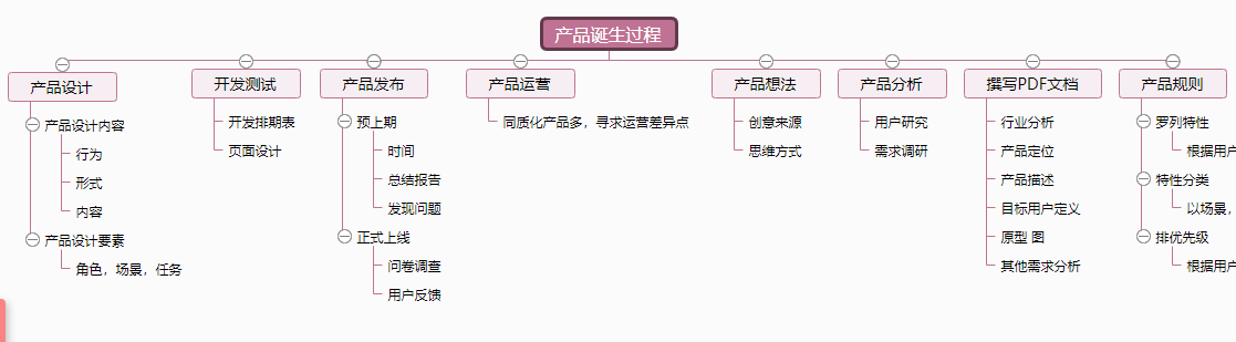 项目产品诞生到运营过程的思维导图,能够清楚的了解到项目产品从设计到运营的过程。产品、项目研发基本流程概述:总体五个阶段、第一阶段需求采集、分析评估;第二阶段产品内部评审;第三阶段产品设计研发;第四阶段产品研发;第五个阶段产品验收。