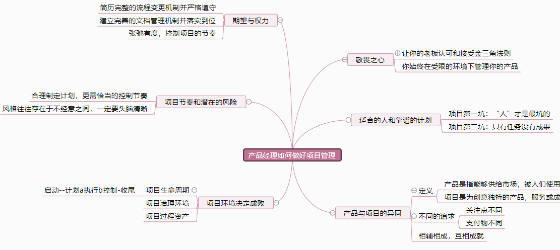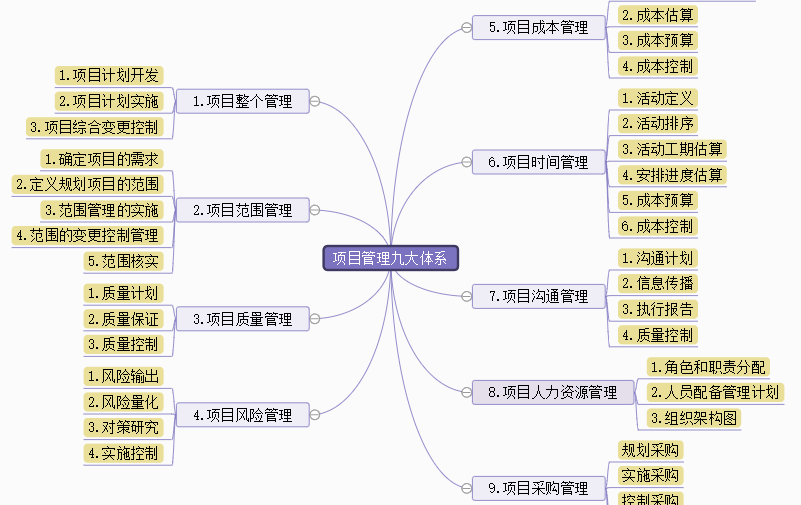 项目管理思维导图包括项目采购管理、项目成本核算、时间管理等关于项目管理的九大体系。项目管理十大领域:进度、成本、质量、范围等4个核心领域,风险、沟通、采购、人力资源、干系人等5个辅助领域,1个整体领域。项目启动:确立一个项目或一个项目阶段。项目规划:为完成项目,制定和维护一个可操作的计划。
