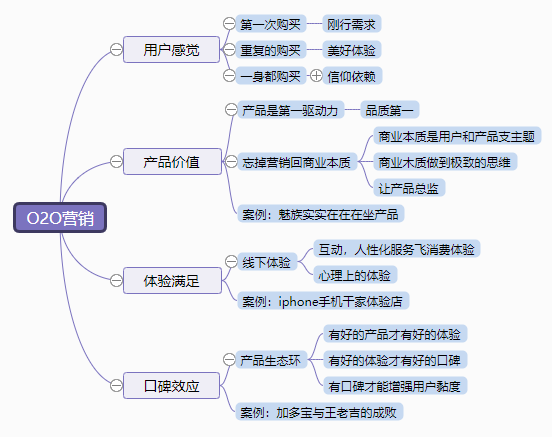 O2O营销结构思维导图,主要是从用户感觉,产品价值,体验满足以及口碑效应四个方面进行详细说明。o2o营销助力企业实现用户数据中台,智能化运营客户,让获客变得更高效,自动化营销,个性化推荐,数据化运营,实现企业业务转型+创新+增长。