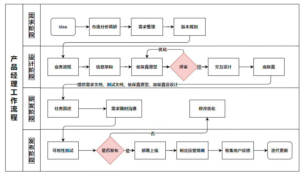 输出产品方案,每一位产品经理都应该有清晰、专业、完整的流程意识,不能一上来就是原型或者需求文档。 作为一名产品经理,画业务流程图是一项必备技能。如何高效的有条不紊的来推动,最重要的是有一套清晰的工作流程。 按照产品从需求到上线的线性路径来讲,这个路径就是产品经理的工作流程。