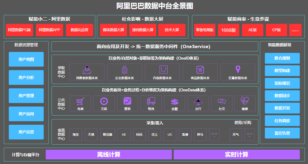 阿里是数据中台概念的首先提出者,其案例更具分析意义。从阿里巴巴数据中台全景图可以看出,阿里的数据中台包括了计算与存储平台、数据资产管理、智能数据研发、统一数据中心中间件(OneService)四大模块,最上层支撑着阿里数据、数据大屏、生意参谋等大数据应用。
