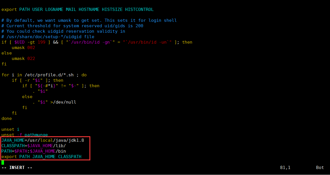 JAVA_HOME=/usr/local/java/jdk1.8 CLASSPATH=$JAVA_HOME/lib/ PATH=$PATH:$JAVA_HOME/bin export PATH JAVA_HOME CLASSPATH