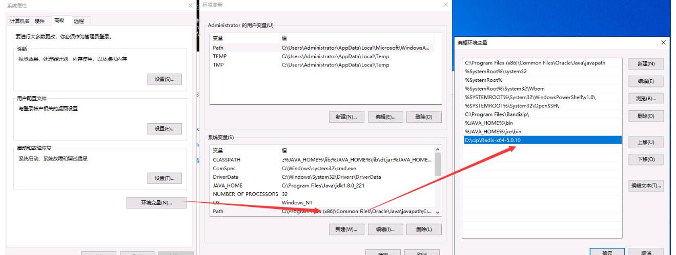 右键此电脑->属性||打开设置->系统->关于,高级系统设置->环境变量,选中系统变量Path点击"编辑",弹出的窗口点击"新建",输入Redis安装目录的绝对路径(可点击"浏览",选择Redis安装目录),全部点击"确定"关闭即可。