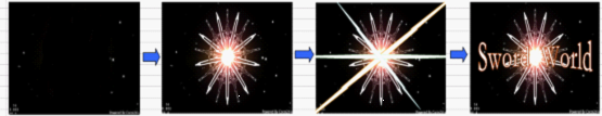 稍稍扯点题外话,6月那时候其实我想自己出来搞个工作室试试能不能赚点小钱,工作室名称预定是《剑世界工作室》(Sword World),不过后来因为家庭原因嗝屁了,orz。工作室肯定要有Logo动画啦,我之前设想是10把剑绕着屏幕中心飞入,相击后播放斩击闪光,斩出工作室名字,效果大概如图: