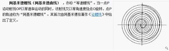 只是简单地飞入感觉有点单调,所以我想设计10把剑呈螺旋飞入,这样效果比直接飞入会好一些。有了想法,网上翻了一些资料,觉得“阿基米德螺线”很符合需求,于是就有了写一个执行“阿基米德螺线”动作的想法。