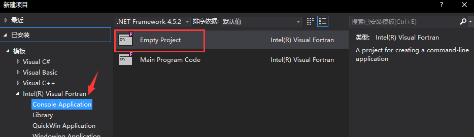 安装完成后打开vs,新建空fortran项目: