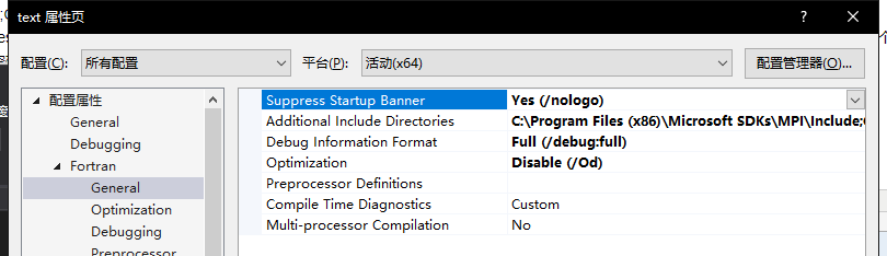 1、在【配置属性】——【Fortran】——【General】——【Additional Inclue Directories】中添加include项目 :C:\Program Files (x86)\Microsoft SDKs\MPI\Include;C:\Program Files (x86)\Microsoft SDKs\MPI\Include\x64;C:\Program Files (x86)\Microsoft SDKs\MPI\Include\x86,其中有三个项目,也可以是两个C:\Program Files (x86)\Microsoft SDKs\MPI\Include\x64;C:\Program Files (x86)\Microsoft SDKs\MPI\Include\x86这两个路径可以根据你编译器的位数,如果自己不知道,建议32位的和64位的都配置,每个路径之间用英文状态下的分号隔开;,不建议用空格。