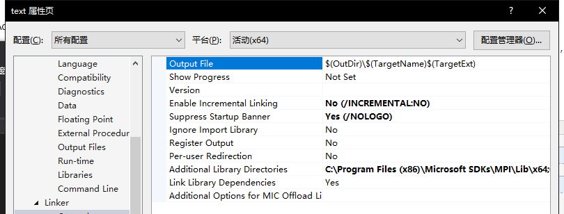 2、在【配置属性】——【Linker】——【General】——【Additional Library Directories】中添加:C:\Program Files (x86)\Microsoft SDKs\MPI\Lib\x64;C:\Program Files (x86)\Microsoft SDKs\MPI\Lib\x86,同样建议32位的和64位的都配置。