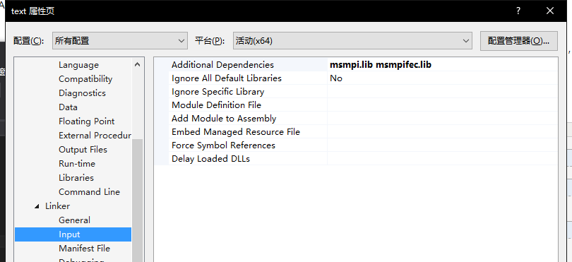 3、在【Linker】——【input】——【Additional Dependencies】中添加msmpi.lib msmpifec.lib两个文件名,文件名之间用空格连接