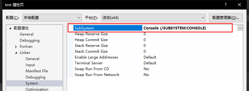 若程序出现错误“Link 出错:fatal error Lnk1561:必须定义入口点”,则在 项目菜单,属性,Linker,System,选 Console: