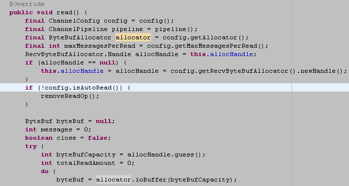 每循环读取一次消息,就通过ByteBufAllocator的ioBuffer方法获取ByteBuf对象,下面继续看它的接口定义: