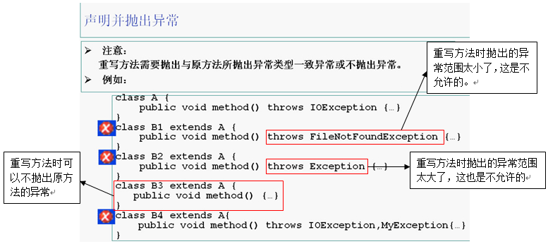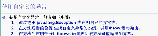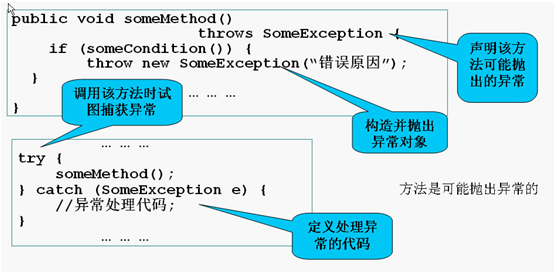 方法声明的时候可以指明这个方法有可能会抛出的异常类型,使用throw抛出异常,声明方法后面有throws声明的可能出现的异常一定要去捕获。