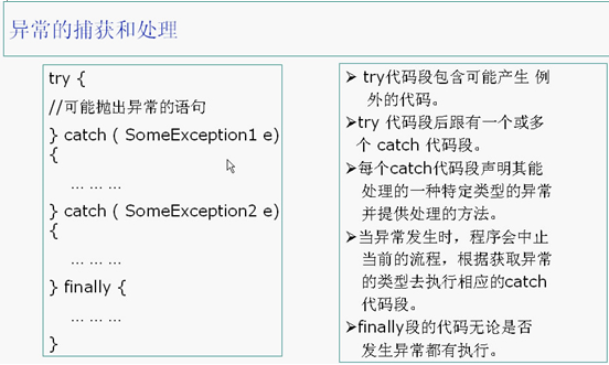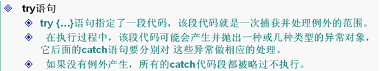 异常是运行期间出现的错误,运行期间出现错误以后JAVA处理这种错误的方式是首先会找相应的catch代码,看看有没有使用catch去捕获异常,如果有catch存在,那么JAVA就会自动跳到catch那里去处理异常,如果没有catch,那么JAVA将会把这个错误抛出去,然后将相关的错误信息打印出来。想用catch捕获异常时必须要写try,没有try就不能用catch,try里面写的是有可能产生异常的语句,catch里面写的是当try里面的语句运行时出现了异常的处理方式。