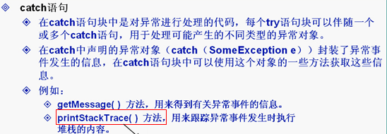 着一个花括号括起来的代码块,它里面放置可能会引发异常的代码块。catch后面对应异常类型和一个