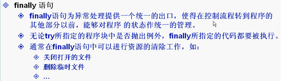 于回收在try块里打开的物理资源,异常机制会保证finally块总会被执行。throws关键字主要在方法签名